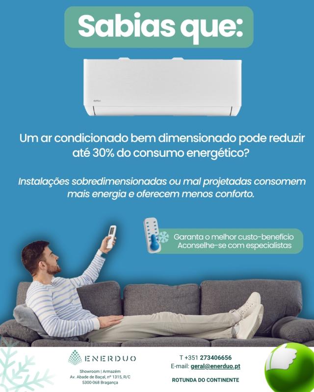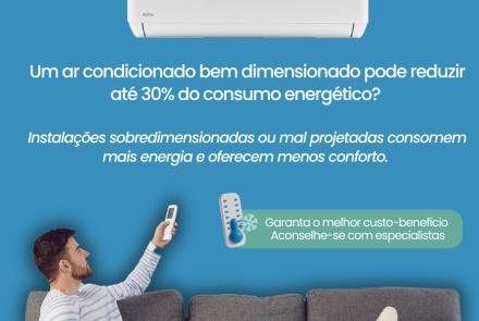 Sabias que! 22 Jul 2025 Um ar condicionado bem dimensionado pode reduzir até 30% do consumo energético?Instalações sobredimensionadas ou mal projetadas consomem mais energia e oferecem menos conforto