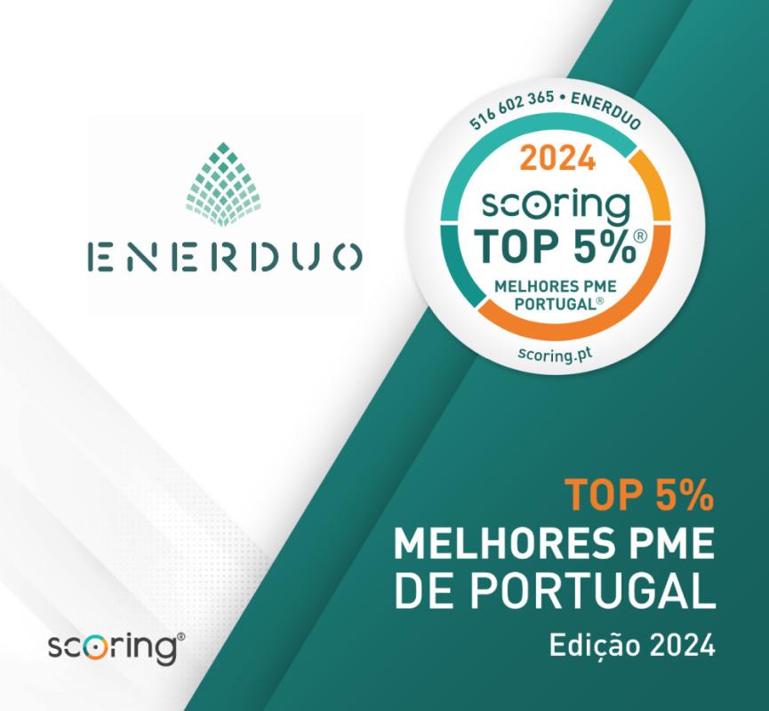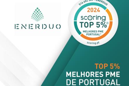 A ENERDUO - ENGENHARIA E CONSULTORIA, UNIPESSOAL, LDA foi certificada como empresa TOP 5% MELHORES PME DE PORTUGAL, Edição 2024, em termos de Desempenho e Solidez Financeira (método ScorePME).